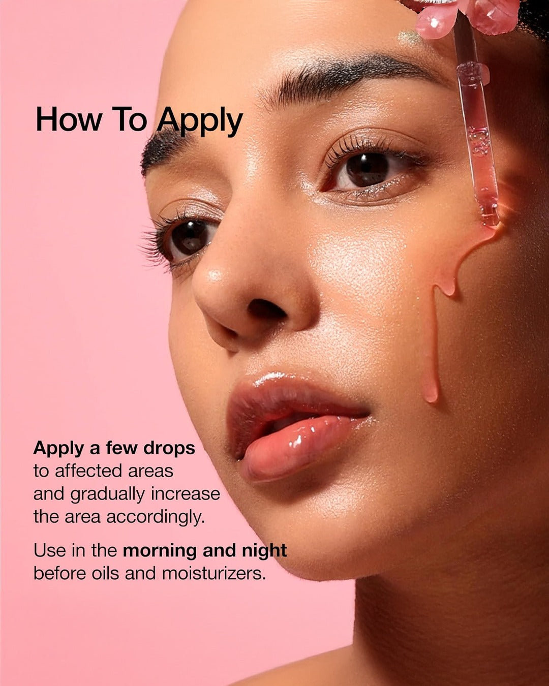 Apply a few drops to affected areas and gently pat in with your fingertips. Gradually increase the usage as needed. Use morning and night before applying oils or moisturizers. When used during the day, be sure to use with SPF 30 or higher.